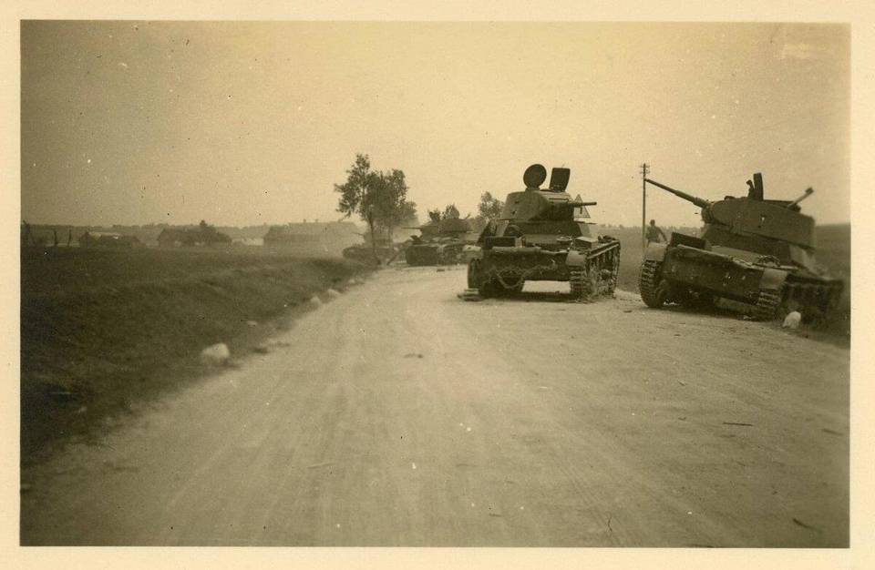 Типичная картина для лета 1941 года. «Танковый падеж» во всей красе – Т-26 просто не выдерживали долгих маршей. Эти тихоходные танки предназначались для поддержки пехоты на поле боя, а им генералы устраивали «забеги» на многие десятки, а то и сотни километров. А советская техника и так склонна к поломкам…