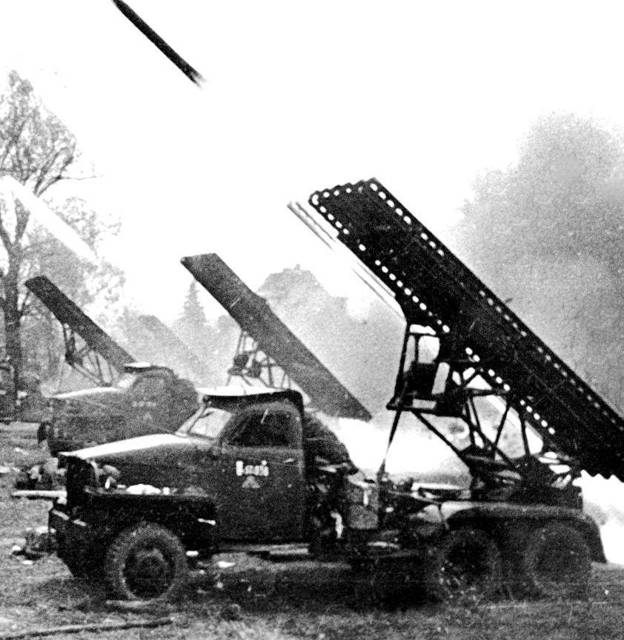 БМ-13, легендарная «катюша» – залп из шестнадцати 132 мм снарядов. Оружие из разряда тех, когда недостаток точности с лихвой заменяется мощностью боеголовки и их количеством…