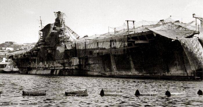 В ходе войны итальянцы переоборудовали быстроходный лайнер «Рома» в самый настоящий ударный авианосец, на манер британских «бронепалубников». Однако нехватка ресурсов давала о себе знать, постройка отставала от графика, не хватало стали – так броневую противоторпедную защиту на булях заменили заливкой 600 мм бетона толщиной, что одновременно улучшило остойчивость. Авиационное оборудование предоставили немцы, но было уже поздно – Италия вышла из войны…