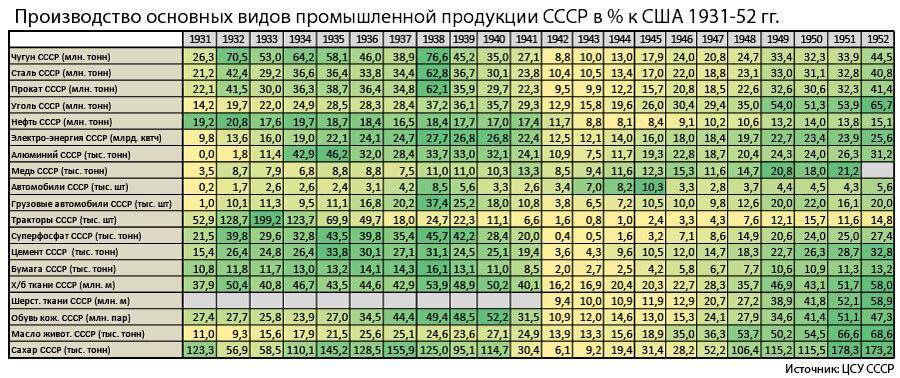 По материалам этой таблицы хорошо видно какую роль сыграла проведенная в СССР индустриализация. Но успех не будет так выразителен, если взять в расчет время «великой депрессии» с последующим выходом США из кризиса. Но в годы войны произошел «обвал» советской экономики с одновременным значительным ростом промышленности Штатов. И лишь только к концу сталинского периода разница в показателях между странами стала медленно выправляться…