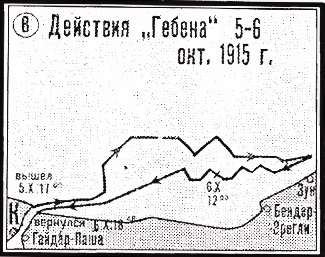 27 и 28 сентября, а также 5 и 6 октября «Гебен» снова конвоировал угольные транспорты (черт. 10, би в).