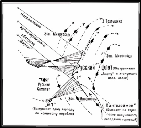 Невдалеке от Варны, в Евксинограде, вплотную к боковому заграждению, удалось найти хорошее место для стоянки подводных лодок. В здании, примыкавшем к дворцу болгарского короля, было найдено помещение для личного состава лодок. Преимущества этой стоянки выяснились 27 октября, когда перед Варной показался русский флот. Три линейных корабля с охранением из 11 эскадренных миноносцев шли вслед за 3 небольшими кораблями яхтенного типа. UB-8 и UB-7 вышли тотчас же с целью атаковать неприятеля. Обе лодки маневрировали для выхода в атаку по концевому линейному кораблю, но были замечены вследствие зеркально гладкой поверхности моря и обстреляны (черт. 11). UB-8 не удалось выпустить торпеды, ввиду того что концевой линейный корабль отвернул. UB-7 незадолго до этого выпустила с дистанции 900 м (5 каб.) торпеду, взрыв которой был хорошо слышен, но из-за сильного обстрела определить результаты было нельзя. Согласно позднейшим сведениям, торпеда подорвала русский линейный корабль «Пантелеймон», получивший столь значительное повреждение, что он на несколько месяцев выбыл из строя [72]72