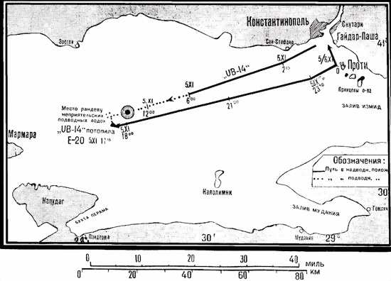 [Закрыть]. После трехдневного пребывания у побережья и уничтожения 4 парусников нельзя было рассчитывать на движение кораблей вдоль берега; поэтому командир решил повернуть назад, и 16 сентября лодка вошла в Босфор.