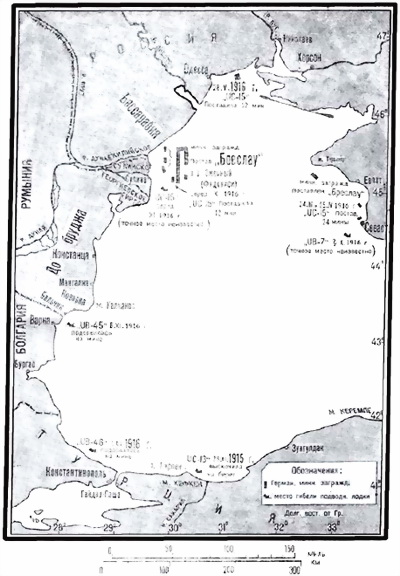 Но и германо-турецкие морские силы терпели серьезные потери. После успешного похода в восточную часть Черного моря UB-45 5 ноября была послана в Варну. 6 ноября утром, отправляясь для операций к Севастополю и выходя в море вслед за парой тральщиков, она подорвалась на вновь поставленном на большой глубине заграждении, над которым мелкосидящие тральщики прошли вполне благополучно, и погибла (черт. 24) [108]108