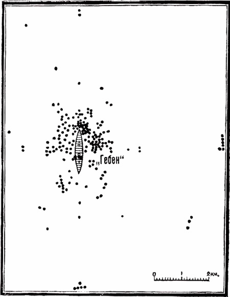 Ежедневные все учащавшиеся воздушные налеты мешали работам на «Гебене», эскадренным миноносцам противолодочного охранения, линейному кораблю «Торгут» и множеству вспомогательных судов. Самолеты днем и ночью неутомимо сбрасывали бомбы. Особенно неблагоприятные условия бывали для «Гебена» в утренние часы, когда туман низко стелился у поверхности воды и только верхушки мачт торчали из него. В таких случаях, услышав звук мотора, все напряженно ожидали сбрасывания бомб, которому нельзя было оказать противодействия. Предупреждения о приближении неприятельских самолетов давались из лагеря десантного отряда, расположенного высоко над уровнем моря в Килия-Тепе. Это давало возможность заблаговременно прекратить перегрузку боевого запаса и укрывать людей. Несмотря на значительное число сброшенных бомб (сосчитано 180), было всего два попадания (черт. 33). 22 января в 11 ч 48 мин одна бомба попала в заднюю трубу и причинила незначительные повреждения трубопроводу сирены; в дымовой трубе она образовала пробоину диаметром в 3 м, которую заделали асбестовыми матами. При этом взрыве был легко ранен дальномерщик. В течение 23 января один воздушный налет следовал за другим. В военном дневнике «Гебена» мы читаем: