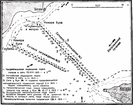 В Германии между тем было заказано большое количество новых буев и стального троса; по освобождении железнодорожного пути через Сербию в Константинополь весь этот материал был доставлен и использован. С уходом англичан и французов с Галлипольского полуострова кончилась и подводная война на Мраморном море. Сетевые заграждения у Нагары и в Босфоре до конца войны выполняли свое назначение.