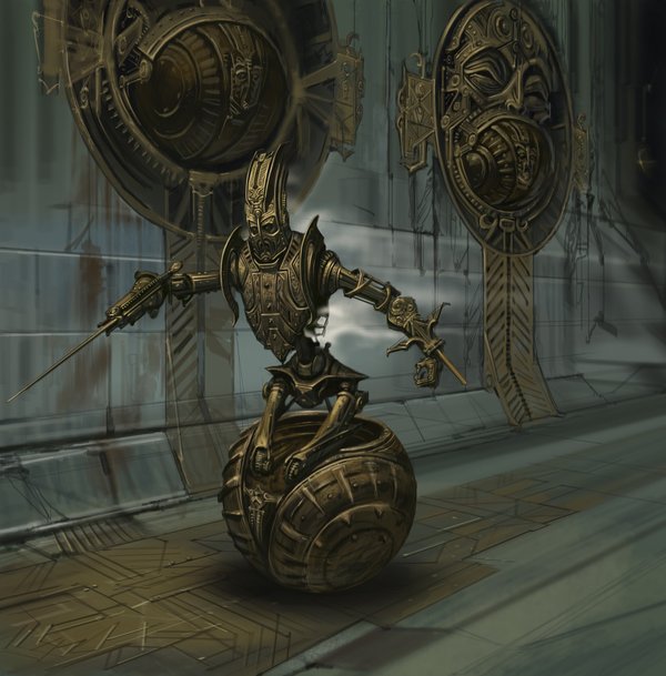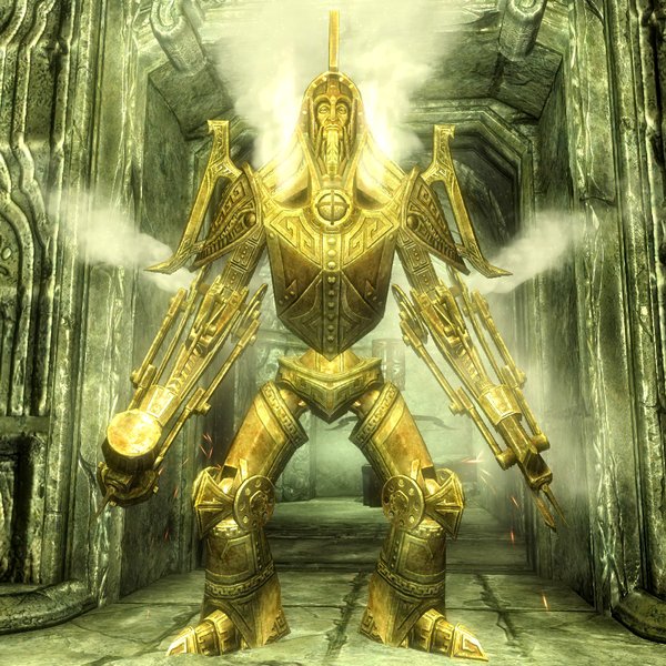 – Автоматоны! – азартно воскликнул я, когда из потайных ниш в стенах, закрытых решётками-дверями из двемерита, выступили два золотистых гиганта, очень недобро взирающих на меня со своих золотистых неподвижных морд.