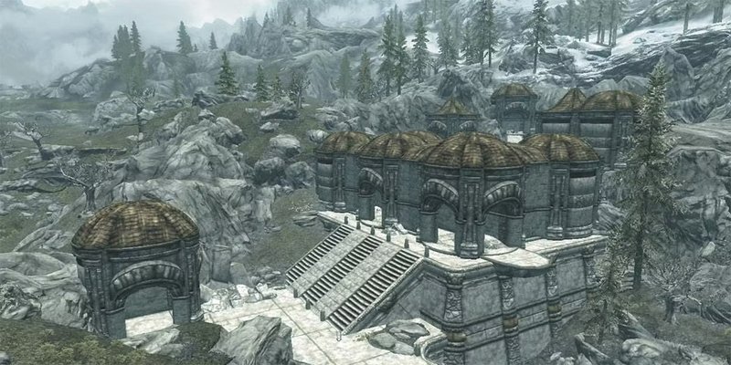 Снаружи ничего примечательного. Несколько цилиндрообразных строений, расположенных на выходящих из-под земли каменных возвышений, сделанных из отдалённого подобия белого мрамора, и выполненных в неподражаемом двемерском стиле.