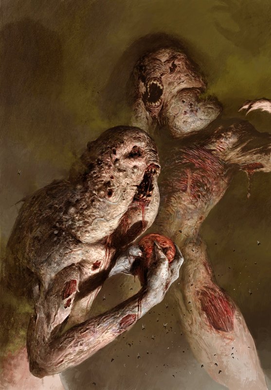 Сами монстры, увидав нашу компанию, принялись издавать характерные для них горловые звуки, будто бы эти твари прямо на месте задыхаются или пытаются что-то вырвать… Это создавало даже вдвойне отвратительный вид этих трупоедов…