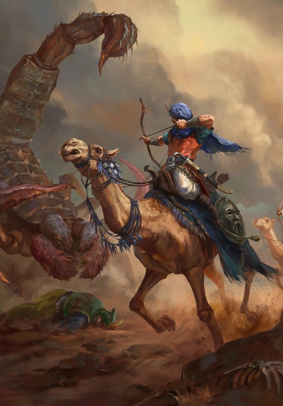 – Это что… Огромные скорпионы? – телепатически донеслось с удивлением первооткрывателя от Нимуэ, когда мы заметили, что на знакомый нам караван внезапно высыпали из барханов замаскированные в песках подобно в снегах огромные членистоногие.