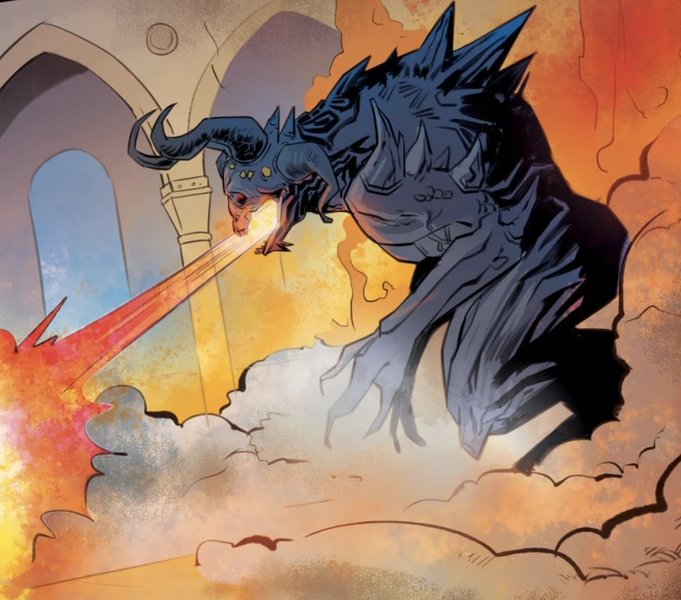 Четырёхметровая рогатая тварь, напоминающая наиклассического демона из преисподней, объятое источаемым горячим паром, соперничающим с драконьим.