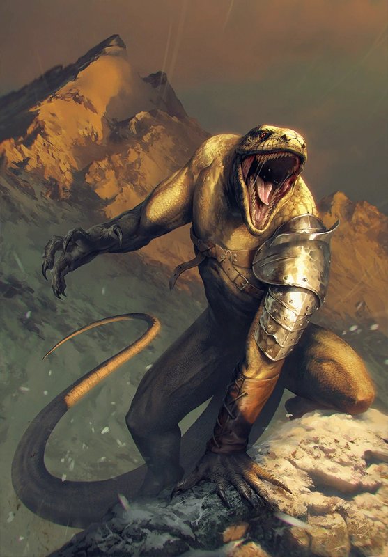 Люди-ящеры, древние слуги драконов – но ныне совершенно свободный народ. К тому же редкий, даже вымирающий – ведь некому их теперь было защищать от эльфов или людей с краснолюдами. И такие товарищи решили объединиться в банду?.. Хм-м-м… Занятно.