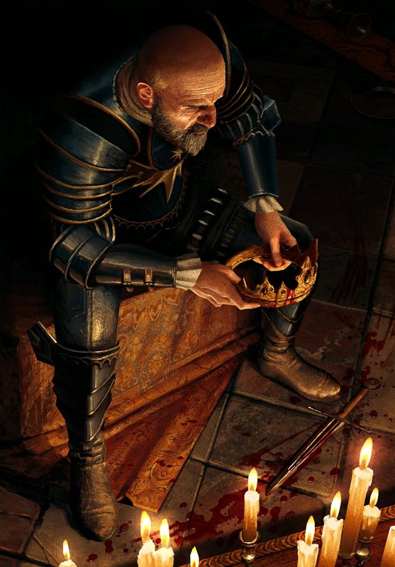 Выхватив кинжал, он сделал сразу десяток яростных ударов ножом прямиком в область груди отца Эмгыра, невольно вызывая у меня ассоциации с одним древним анекдотом… Тот, который про двадцать восемь ударов и действия наверняка. Так или иначе, бородатый лысич, выглядящий как типичный Главный Злодей, не добившийся добровольной (почти) передачи короны, забрал её сам.