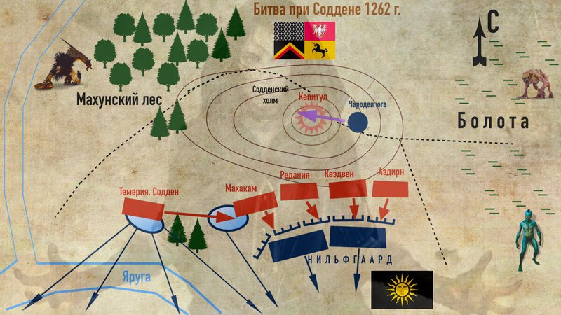 Зная о прекрасной кавалерии Нильфгаарла, которая в отличии от битвы с Цинтрой, смогла себя реализовать в битве против короля Соддена, войска Четырёх Королевств и Махакама (я заявился к ним и попросил помочь Северянам в обмен на несколько необременительных услуг) решили занять склоны самого холма.