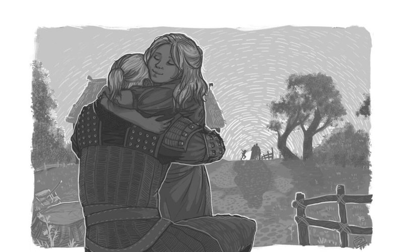 Ведьмак мягкими движениями, донельзя мягкими, дабы ничем ненароком не повредить ведьмачьей силой, приблизился к ней ещё ближе. Девочка рванула вперёд трусцой… И вот, за какие-то сущие мгновенья Геральт оказывается на коленях, и тонкие ручки девочки оказываются вокруг его шеи, её пепельные волосы оказываются на его плечах.