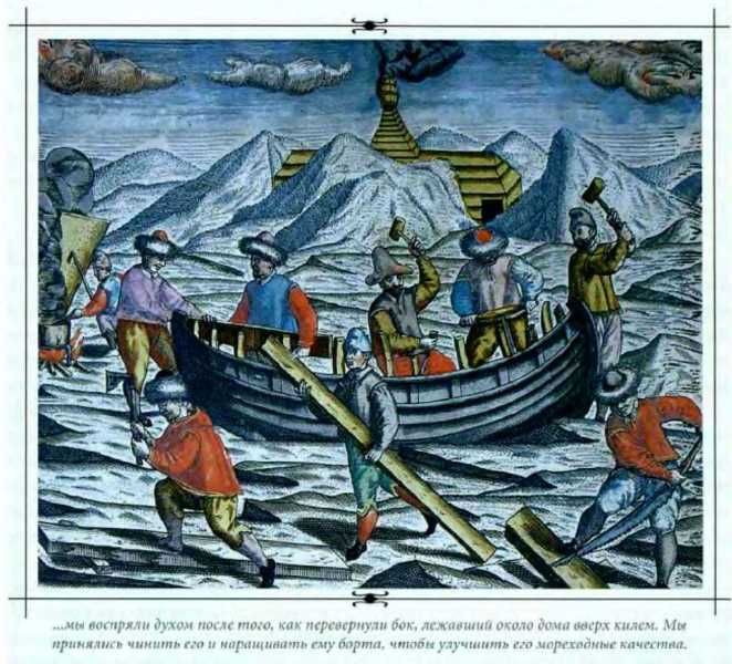 Вернувшись после полудня домой совершенно расстроенные, мы воспряли духом после того, как перевернули бок, лежавший около дома вверх килем. Мы принялись чинить его и наращивать ему борта, чтобы улучшить его мореходные качества. Мы рассчитывали на то, что нам предстоит долгий и мучительный путь, в котором нас ждут самые неожиданные несчастья, так что для подготовки к этому морскому переходу надо использовать все средства, какие только можно придумать.