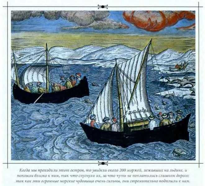 [Закрыть]. Когда мы проходили этот остров, то увидели около 200 моржей, лежавших на льдине, и поплыли близко к ним, так что спугнули их, за что чуть не поплатились слишком дорого: так как эти огромные морские чудовища очень сильны, они стремительно подплыли к нам (как будто желая отомстить за то, что мы их потревожили) и со страшным шумом окружили лодки, словно собирались нас уничтожить, но мы все же ускользнули благодаря попутному ветру. Тем не менее с нашей стороны было неблагоразумно разбудить спящих собак.