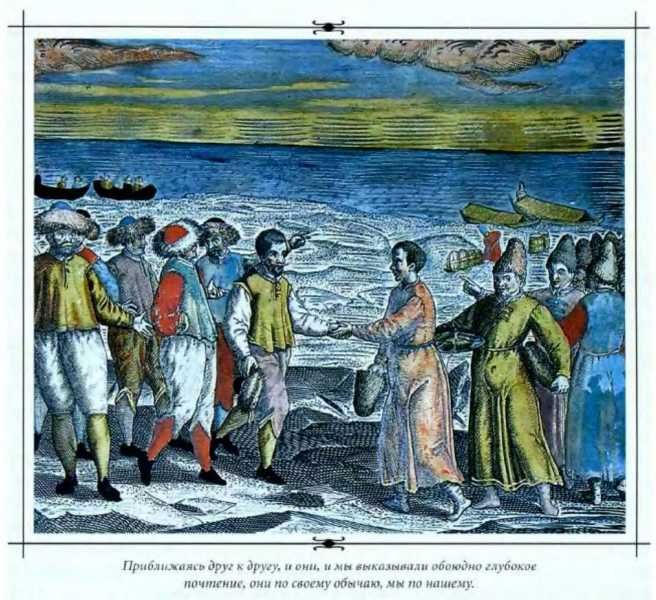[Закрыть], пройдя 6 миль в направлении SSO. Добравшись до этого места, мы обнаружили за мысом две русские лодьи. Нас отчасти обрадовало, что наконец-то мы добрались до таких мест, где есть люди, но, с другой стороны, нас испугало, что их так много, потому что мы видели по крайней мере человек 30 и не знали, что это за люди, дикие или какие-то другие иностранцы. С большим трудом мы до брались до земли, а они, увидев нас, бросили работу и пошли в нашу сторону, но без оружия, и мы тоже сошли на землю – те из нас, кто был достаточно здоров, потому что многие очень страдали и совсем ослабли от цинги. Приближаясь друг к другу, и они, и мы выказывали обоюдно глубокое почтение, они по своему обычаю, мы по нашему. Но сойдясь поближе, мы посмотрели друг на друга с жалостью, потому что некоторые из них узнали нас, а мы их, это были те же люди, которые два года назад, когда мы проходили пролив Вайгач, поднимались к нам на корабль. Тут мы заметили, что они огорчены и расстроены нашим видом, ведь в тот раз у нас все было так хорошо, мы плыли на большом прекрасном корабле, богато оснащенном, который привел их в восхищение, а теперь мы были такие тощие и жалкие и плыли в открытых лодочках. Среди них было двое, которые дружески похлопали по плечу меня и шкипера, поскольку узнали нас по прошлой встрече (так как кроме меня и его в Вайгаче тогда не было никого), и спросили про наш crabble, как они называли наш корабль, что с ним случилось? Мы объяснили, насколько могли, (поскольку переводчика у нас не было), что наш корабль остался во льду. Тогда они спросили: «crabble pro pal?», и мы поняли это так: «Вы потеряли корабль?» И мы ответили: «crabble pro pal», то есть «да, мы потеряли корабль», но много разговаривать с ними мы не могли, так как не понимали друг друга. Правда, они показывали своими лицами, что сочувствуют нам и жалеют о том, что раньше вместе с нами плыло столько кораблей, а теперь мы находимся в столь жалком состоянии; они показали также, что тогда на нашем корабле пили вино, и спрашивали, какой теперь у нас напиток? Поэтому один из наших моряков пошел к шкоуту, набрал из бочонка воды и дал русским ее попробовать, но те покачали головой и сказали: «no dobbre», что значит «не хорошо». Тогда наш шкипер подошел к ним поближе и показал им открытии рот, чтобы объяснить, что нас мучает цинга, и спросить, не знают ли они от нее средства. Но они поняли, что мы голодны, и один из них пошел к своей ладье и принес круглый ржаной хлеб весом около 8 фунтов[421]421