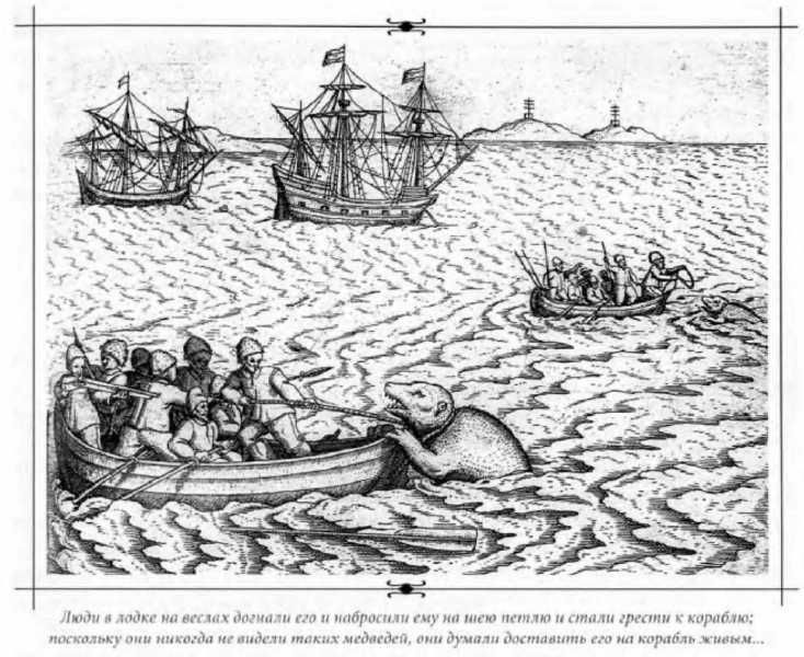 [Закрыть], близ острова Виллема, и заприметили там белого медведя. Увидев его, люди быстро спрыгнули в лодку и выстрелили медведю в туловище. Но оказалось, что белые медведи обладают поразительной силой, превосходящей силу почти всех других животных, какой нет ни у льва, ни у прочих диких зверей, – потому что несмотря на рану он встал на лапы и уплыл прочь. Люди в лодке на веслах догнали его и набросили ему на шею петлю и стали грести к кораблю; поскольку они никогда не видели таких медведей, они думали доставить его на корабль живым, а потом показать всем в Голландии. Но медведь оказался так силен и смел, что они остались рады, что сами смогли спастись от него, и в конце концов удовольствовались только его шкурой. Медведь производил ужасный шум и был так силен, что не описать. Сначала они хотели вымотать его и ослабили веревку, чтобы он мог плавать туда-сюда, таская за собой шлюпку. Потом Виллем Баренц понемножку стал подтягивать зверя, но медведь сам поплыл к лодке и полез на корму, так что Виллем Баренц сказал: ему надо немного отдохнуть, но у медведя на уме было другое: он с силой полез в лодку и уже забрался в нее половиной туловища. Моряки так испугались, что убежали на другой конец лодки и уже думали, что им конец. Но счастливая случайность спасла их, так как петля, стягивавшая медведю шею, зацепилась за руль на корме, отчего зверь не мог залезть в лодку дальше. Пока он так лежал неподвижно, одни из моряков опомнился, вернулся назад с носа лодки и вонзил в него короткое копье, так что медведь упал обратно в воду. Тогда они стали грести назад к кораблю и тащили за собой медведя, пока он совсем не лишился сил. Тут его забили насмерть, сняли с него шкуру, и отвезли шкуру в Амстердам.
