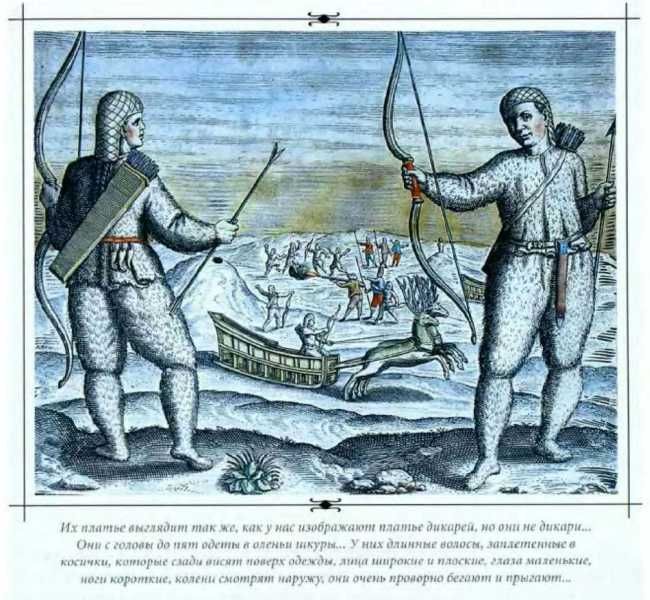 Их платье выглядит так же, как у нас изображают платье дикарей, но они не дикари, так как у них есть здравый смысл. Они с головы до пят одеты в оленьи шкуры, за исключением знатных особ, которые (и мужчины и женщины) одеты так же, как остальные, но только головные уборы сделаны из цветного сукна с подкладкой из ценного меха, в то время как все прочие носят шапки из оленьих шкур, мехом наружу, плотно прилегающие к голове[174]174
