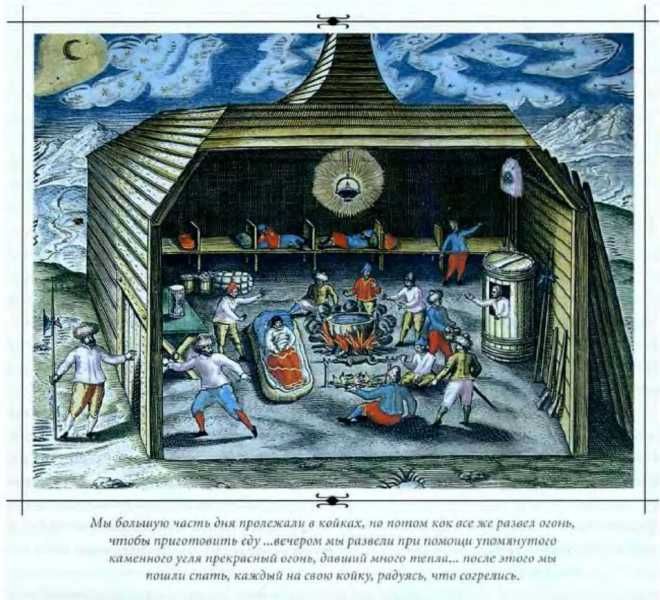 7 декабря скверная погода продолжалась, свирепствовал ураган и ветер NO, который принес сильнейший холод; мы не знали, что предпринять, чтобы защититься от него. Когда мы совещались, что делать, один из нас предложил использовать каменный уголь, который мы перенесли с корабля в дом, и развести им огонь, так как этот уголь дает сильный и продолжительный жар. Поэтому вечером мы развели при помощи упомянутого каменного угля прекрасный огонь, давший много тепла, но не убереглись при этом от большой беды. Поскольку тепло заметно прибавило нам сил, мы стали совещаться, как бы подольше удержать его. Мы решили закрыть дверь и дымоход, чтобы не выпускать это чудесное тепло; после этого мы пошли спать, каждый на свою койку, радуясь, что согрелись. Мы долго разговаривали между собой, но в конце концов у нас началось сильное головокружение, у одних сильнее, у других слабее. Первым мы заметили головокружение у того из нас, который был болен и потому хуже его переносил, а за тем и все почувствовали недомогание, что сильно испугало нас. Те, кто был посильнее, встали с коек и прежде всего открыли дымоход, а потом дверь, но тот, кто отворял дверь, потерял при этом сознание и с громким стоном упал на снег. Я, чья койка была ближе всего к двери, услышал стон и пошел посмотреть. Увидев его лежащим в обмороке, я сейчас же принес уксус и натер ему лицо, от чего он пришел в себя. При открытой двери нас освежил и оживил тот же самый холод, который раньше был для нас ярым врагом, но теперь спас нас, так как иначе мы все без сомнения погибли бы, не возвращаясь в сознание. Затем, когда мы пришли в себя, шкипер дал каждому немного вина для укрепления сердца.