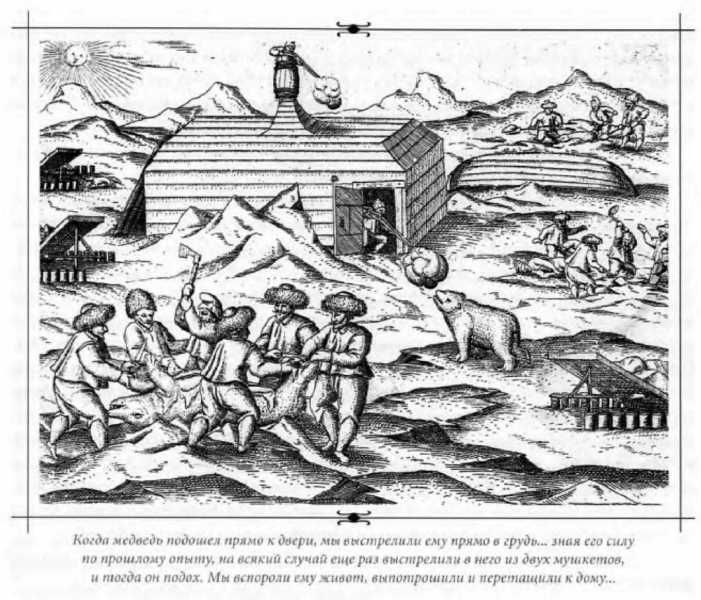 12 февраля погода была ясная и тихая; ветер SW. Мы опять очистили ловушки и капканы. Между тем к дому подошел огромный медведь, так что мы поспешили в дом и приготовились стрелять в него через дверь из ружей и мушкетов. Когда медведь подошел прямо к двери, мы выстрелили ему прямо в грудь, так что пуля прошла через все его тело и вышла у хвоста; эта свинцовая пуля была совсем плоская, точно медный грош, расплющенный молотком. Медведь, почувствовав ранение, сделал прыжок назад, отошел от дома на 20 или 30 шагов и упал. Тогда все быстро выбежали из дома и бросились к медведю: он был еще жив, так как поднял голову и повернул ее к нам, будто хотел посмотреть, кто в него стрелял. Мы же, зная его силу по прошлому опыту, на всякий случай еще раз выстрелили в него из двух мушкетов, и тогда он подох. Мы вспороли ему живот, выпотрошили и перетащили к дому, где сняли шкуру и собрали с нее почти сто фунтов жира, который растопили и заправили в светильники. Это было нам очень кстати, потому что мы могли теперь стать менее бережливыми и оставлять огонь в светильниках на всю ночь, тогда как раньше не позволяли себе этого из-за недостатка масла. Теперь каждый из нас держал свой собственный светильник у своей койки зажженным столько, сколько ему хотелось. Шкура была 9 футов в длину и 7 в ширину[334]334
