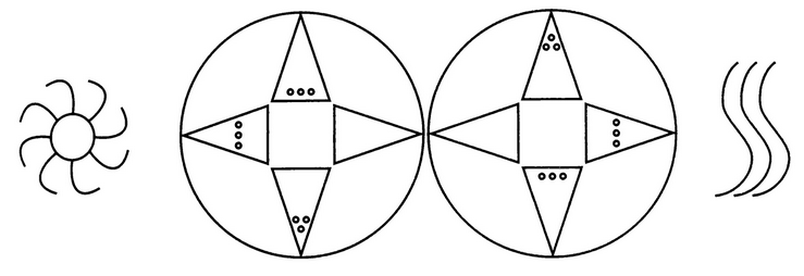 Он подошел ближе, чтобы приглядеться. Два круга-близнеца – как золотые обручи? – излучали молочно-белое свечение. Внутри каждого имелось нечто вроде креста с перекладинами из четырех треугольников. Некоторые из треугольников – или, может, это пирамиды? – украшали маленькие точки. В середине, у основания или у верхушки – у всех по-разному.