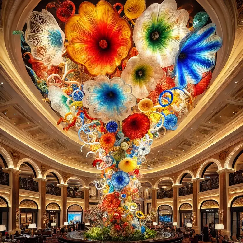 Одной из главных достопримечательностей отеля являются знаменитые фонтаны «Белладжио» – шоу синхронизированных фонтанов на искусственном озере перед отелем, которые «танцуют» под музыкальные композиции. Сам отель – это одно громадное произведение искусства. Чего стоит только Fiori di Como – огромная инсталляция из цветных стеклянных цветов, созданная известным художником Дейлом Чихули, которая украшает потолок вестибюля. Это произведение искусства символизирует весенние цветы, распускающиеся в садах Комо.