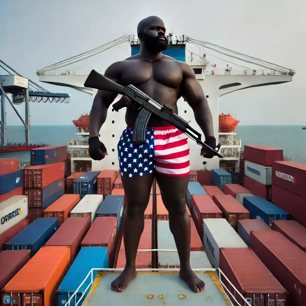 Забравшись на борт, он огляделся: капитанская рубка находилась чуть в стороне. Сделав круговое движение шеей и разминая затёкшие мышцы, рядовой Томпсон поудобнее перехватил автомат Калашникова 1947 года выпуска и шагнул в сторону рубки. Удача сегодня была не на его стороне: подол туники зацепился за крюк, и как только Самуэль рванул вперёд, туника расползлась по швам, и рядовой Томпсон остался с автоматом и в одних звёздно-полосатых плавках (флаг США).