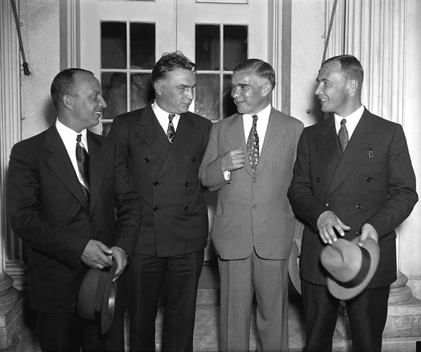 Летчики В.П. Чкалов, Г.Ф. Байдуков, А.В. Беляков, совершившие беспосадочный перелет Москва – Северный полюс – Ванкувер, с послом СССР в США А.А. Трояновским. 1937 год