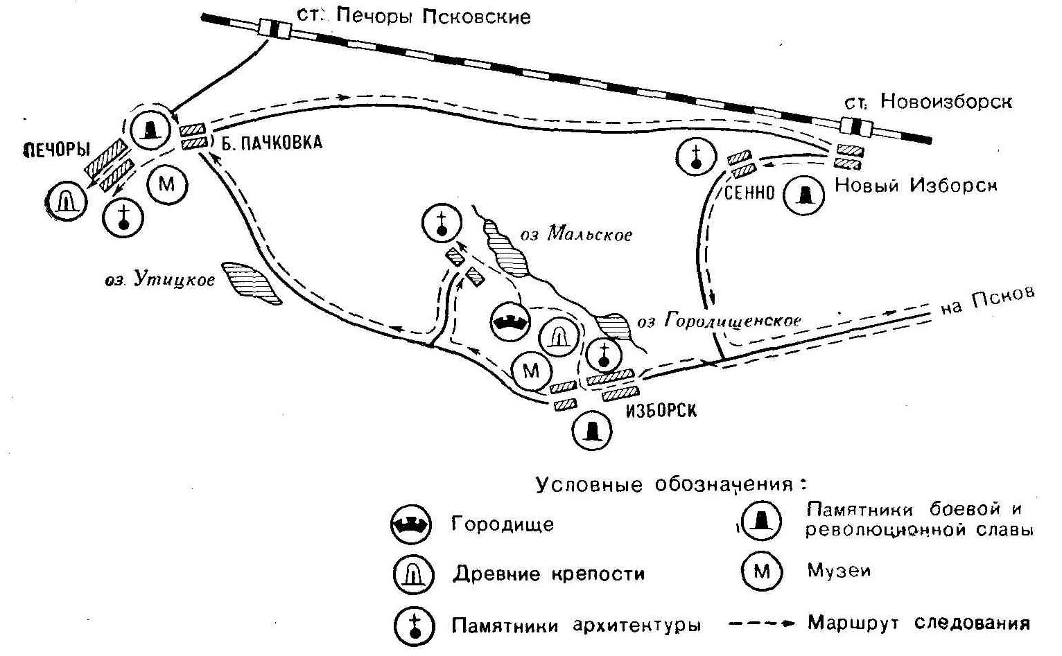 СХЕМА ТУРИСТСКОГО МАРШРУТА ИЗБОРСК – ПЕЧОРЫ – НОВЫЙ ИЗБОРСК.