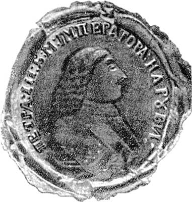 На рис. 69 приведена печать военной коллегии Пугачева. На ней изображен имперский двуглавый орел. Надпись вокруг гласит: «ВОЕНОI КОЛЕГI ПЕЧАТЬ», то есть «военной коллегии печать». Итак, у Пугачева, оказывается, была своя военная коллегия.