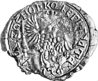 Рис. 69. Печать военной коллегии Пугачева. Изображен имперский двуглавый орел. Надпись вокруг: «ВОЕНОI КОЛЕГI ПЕЧАТЬ». Оказывается, у Пугачева была своя военная коллегия. Взято из [5], вклейка между страницами 288 и 289