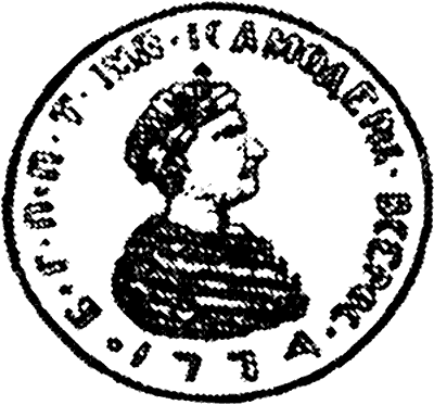 Рис. 70. Изображение печати Пугачева. Надпись: «Б. Г. П. П. Т. IМП. IСАМОДЕРЖ. ВСЕРОС. 1774». То есть: «Б[лаговерный] Г[осударь] ПЕТР ПЕТРОВИЧ (! – Авт.) ТРЕТИЙ ИМПЕРАТОР И САМОДЕРЖЕЦ ВСЕРОССИЙСКИЙ. 1774». Взято из [5], вклейка между страницами 128 и 129