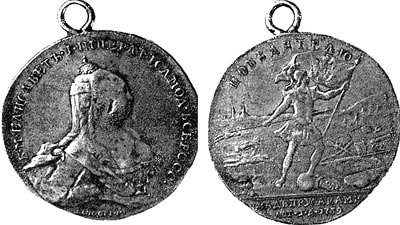 Рис. 72. Медаль Елизаветы Петровны «Победителю над прусаками. 1759». Якобы ИМЕННО ЭТОЙ медалью Пугачев награждал свои войска. Что было бы глупо – ведь на медали изображен явно не он, а женщина-императрица. Скорее всего. Петр III награждал своих соратников СОВСЕМ ДРУГОЙ медалью за победу НАД ПРУССАКАМИ, подчеркивая, что захватившие русский престол люди – это пруссаки, то есть иностранцы. Взято из [5], вклейка между страницами 288 и 289