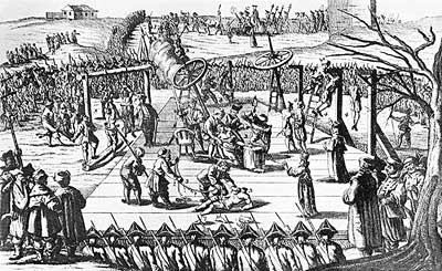 На рис. 74 приведена старинная гравюра XVIII века «Казнь Пугачева». Изображена массовая казнь казаков.
