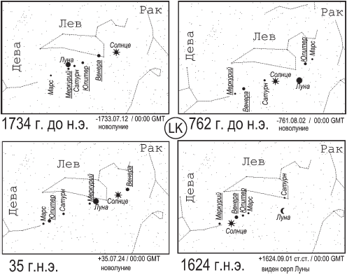 Рис. 3.2. Четыре решения гороскопа «все планеты во Льве» на интервале от –3000 до +2000 года. Еще одно решение (1007 год н.э.) изображено выше на рис. 1.15. Видно, что ни одно из решений этого гороскопа не соответствует зодиаку LK