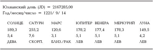 Астрономические расчеты показали, что выдвинутому нами требованию удовлетворяет только одна дата на всем интервале от –3000 до +2000 года. Это – утро 14 сентября 1221 года. Положения планет на эклиптике были следующими. Как обычно, мы даем долготу на эклиптике J2000 в градусах, а также положение планеты по шкале созвездий, см. раздел 5.10 в [НХЕ].