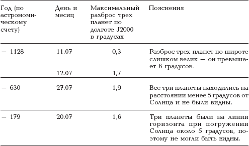 Будем требовать, чтобы максимальное взаимное расстояние между Меркурием, Венерой и Юпитером не превосходило одного градуса дуги. Сближение на большее расстояние вряд ли могло быть воспринято древним астрономом как настоящее слияние трех планет. Даже при наблюдении невооруженным глазом.