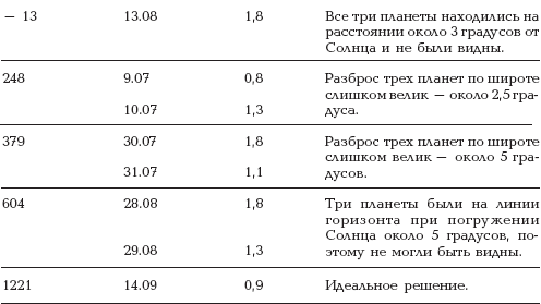 См. раздел 7.6 в [НХЕ] и датировку зодиака MT в разделе 1.1 главы 1 настоящей книги. В приводимой здесь таблице указано только по одной дате для каждого решения. Гороскоп «все планеты во Льве» удовлетворялся в течении 1–3 дней вокруг каждой из этих дат.