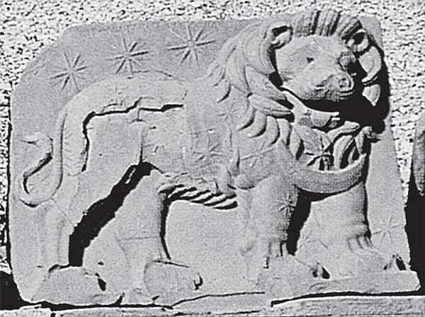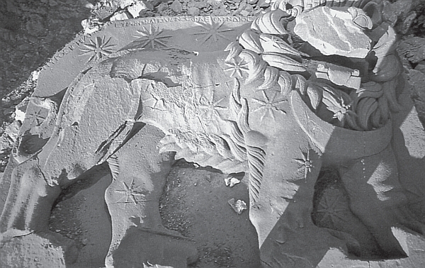 Сравнение современной фотографии с более ранней прорисовкой «Льва Коммагены», приведенной выше на рис. 3.1, наглядно показывает – насколько быстро в наше время разрушаются подлинные старинные памятники. На прорисовке видно, что у Льва была отбита только одна передняя лапа, рис. 3.1. На современной же фотографии у него отбиты уже все четыре лапы, часть живота и бедро. Три планеты надо Львом и надписи пока сохранились. На фотографии надписи видны плохо, но все же они проглядываются, рис. 3.5.