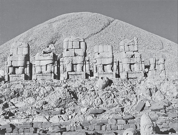 Рис. 3.4. Могильник Антиоха I, царя Коммагены. Горный хребет Немрут-Даг в юго-восточной Турции. Современная фотография. Здесь третье изваяние справа – это «Лев Коммагены» с зодиаком, на котором записана дата 14 сентября 1221 года н.э. Следовательно и сам могильник создан не ранее этого времени. Взято из [8], с. 152