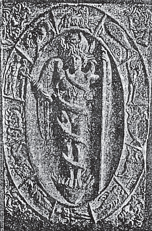 Рис. 4.1. Барельеф, найденный в Лондоне. Изображен Митра. убивающий быка. Вокруг него по кругу идут 12 знаков Зодиака. Взято из [7], с. 79