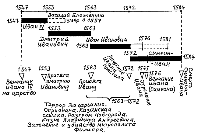 Основные этапы террора: учреждение опричнины (1564), казанская ссылка (1565), заговор конюшего Федорова-Челяднина, разгром Новгорода (1569–1570), убийство митрополита Филиппа и казанского архиепископа Германа, убийство родственника царя князя Владимира Андреевича, массовые казни бояр в 1568 году.