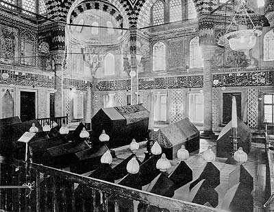 Между прочим, обратите внимание на дату ПОСЛЕДНЕГО султанского захоронения в Большой Софии. Это 1702 год. Наверное, с начала XVIII века в Стамбуле наконец-то появились новые большие и уже «настоящие» мусульманские мечети. В которых теперь и начали хоронить последующих султанов. Бывших уже настоящими МУСУЛЬМАНАМИ и не желавшими быть похороненными в ХРИСТИАНСКОМ храме Большой Софии. Да и отношение султанов к Большой Софии к этому времени, по-видимому, резко изменилось. Недаром именно около 1750 года, как мы уже говорили, они начали закрывать ее христианские мозаики штукатуркой. Таким образом, складывается ощущение, что до начала XVIII века в Стамбуле был ТОЛЬКО ОДИН БОЛЬШОЙ ХРАМ. И это была христианская Большая София. А до XVI века не было и его. Поэтому первые султаны похоронены в других местах.