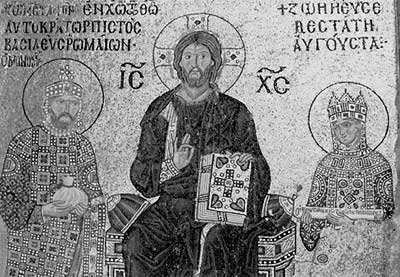 Рис. 1.29. Мозаика в храме Большой Софии. Считается, что справа и слева от Христа изображены император Константин IX и императрица Зоя. Однако надпись над головой царя явно переложена, причем изменено, в частности, имя царя. Взято из [110], с. 44. См. также [105], с. 14.