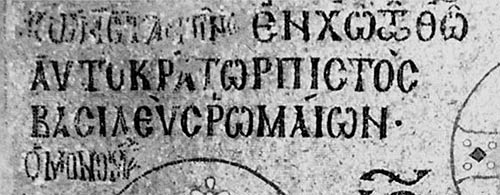 Рис. 1.30. Увеличенный фрагмент надписи на мозаике. Совершенно очевидно, что надпись перекладывали. Изменили в том числе и имя царя. Взято из [110], с. 44. См. также [105], с. 14.