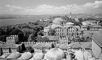 Рис. 1.31. Вид на стамбульский дворец Топкапи с крыши храма Святой Софии. Совсем рядом, за первым поясом дворцовых стен, прямо внутри дворца находится храм Святой Ирины. Взято из [104], с. 13.