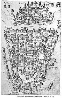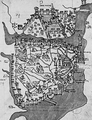 Рис. 1.35. Старинное изображение Царь-Града, датируемое якобы примерно 1450 годом. Карта из рукописи Buondelmonte, «Liber Insularum…», Italian ms., ca. 1450. Взято из [109], карта LVIII.