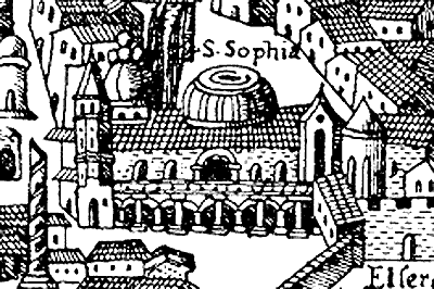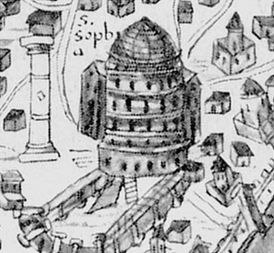 Таким образом, самый старый сохранившийся план Царь-Града XV века подтверждает нашу мысль, что В XV ВЕКЕ СОВРЕМЕННЫЙ ХРАМ БОЛЬШОЙ СОФИИ ТАМ ЕЩЕ НЕ СТОЯЛ.